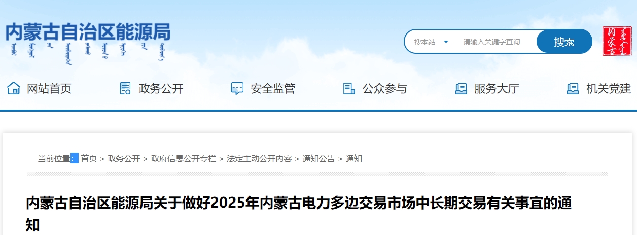 内蒙古自治区能源局关于做好2025年内蒙古电力多边交易市场中长期交易有关事宜的通知