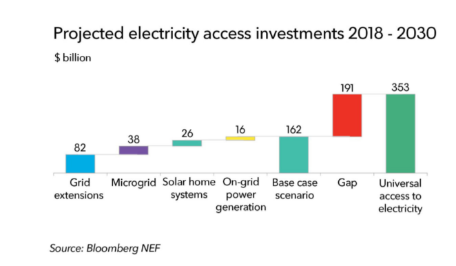 然而,到2020年中期,分布式技术将建立供应链和更便宜的组件。此外,在那时,电网扩展和微电网之间的竞争在经济上可行的区域将更少。基于这些假设,彭博社团队认为,到2030年,有2.38亿户家庭获得电力供应,7200万家庭将使用太阳能家庭系统,3400万家庭将从微电网获取能源。
