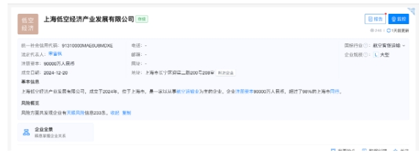 天眼查显示,12月20日,上海低空经济产业发展有限公司注册成立。这是一家以从事航空运输业为主的企业,法定代表人为宋雪枫,注册资本9亿元人民币。