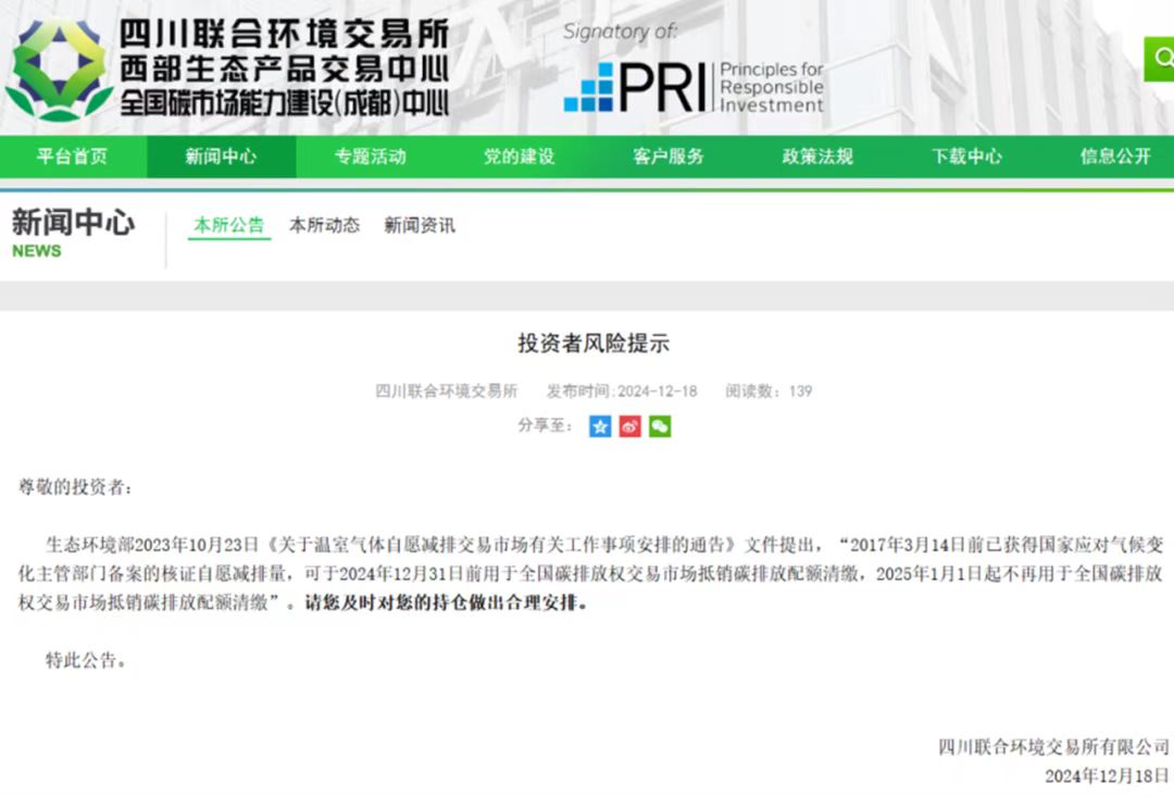 12月18日,四川联合环境交易所有限公司发布《投资者风险提示》:“2017年3月14日前已获得国家应对气候变化主管部门备案的核证自愿减排量,可于2024年12月31日前用于全国碳排放权交易市场抵销碳排放配额清缴,2025年1月1日起不再用于全国碳排放权交易市场抵销碳排放配额清缴。请您及时对您的持仓做出合理安排。”
