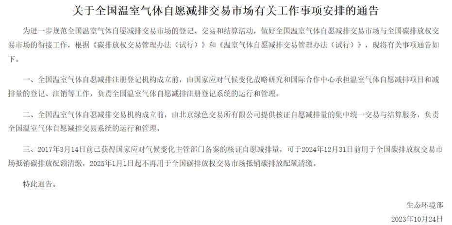 2023年10月,生态环境部发布《关于全国温室气体自愿减排交易市场有关工作事项安排的通告》,正式为2017年3月14日前的CCER设定了“deadline”。