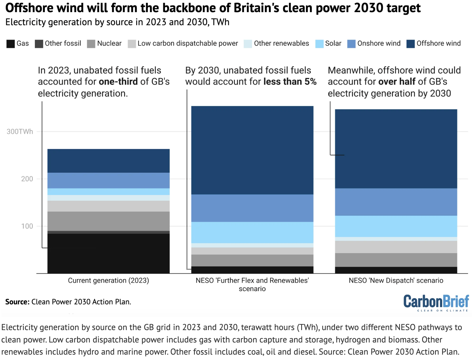 NESO提供了两条通往2030年清洁能源的不同路径,但它们有很多相同的特点,风能和太阳能在这两种情况下都占最大份额。在2023年,化石燃料占国家发电量的三分之一,风能和太阳能占三分之一,其余来自核能、生物质和进口。到2030年,如果实现清洁能源目标,未减排的化石燃料将占发电量的不到5%,风能和太阳能将占大约80%。海上风能将成为2030年英国电力混合能源的支柱,满足大约一半的需求,无论是在NESO的“新调度”情景下,还是在“进一步灵活性和可再生能源”下。