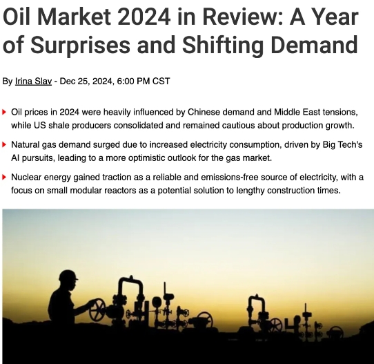 对于世界能源来说,2024年是多事的一年:中东的石油供应恐慌、电力需求激增以及核能复兴都是2024年的标志,天然气需求也在增加。所有这些趋势似乎都将持续到2025年,能源转型的道路上将面临越来越严峻的挑战。