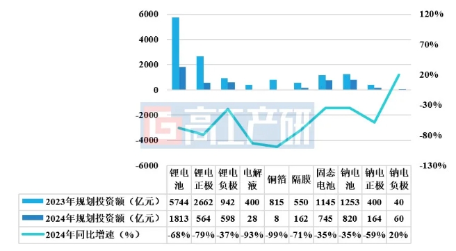 2024年我国锂电新能源行业进入调整期,投资扩产项目大幅减少。据不完全统计,2024年中国锂电池及主要材料、钠电池及正负极材料、固态电池共规划投资约4960亿元,同比下降64%。具体来看: