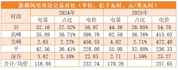 对比风电来看,2025年风电双边申报价格提高10%以上达到0.257元/kWh。2025年风电申报170.26亿kWh,同比增长45.67%,申报均价0.25705元/kWh,同比增长10.68%。