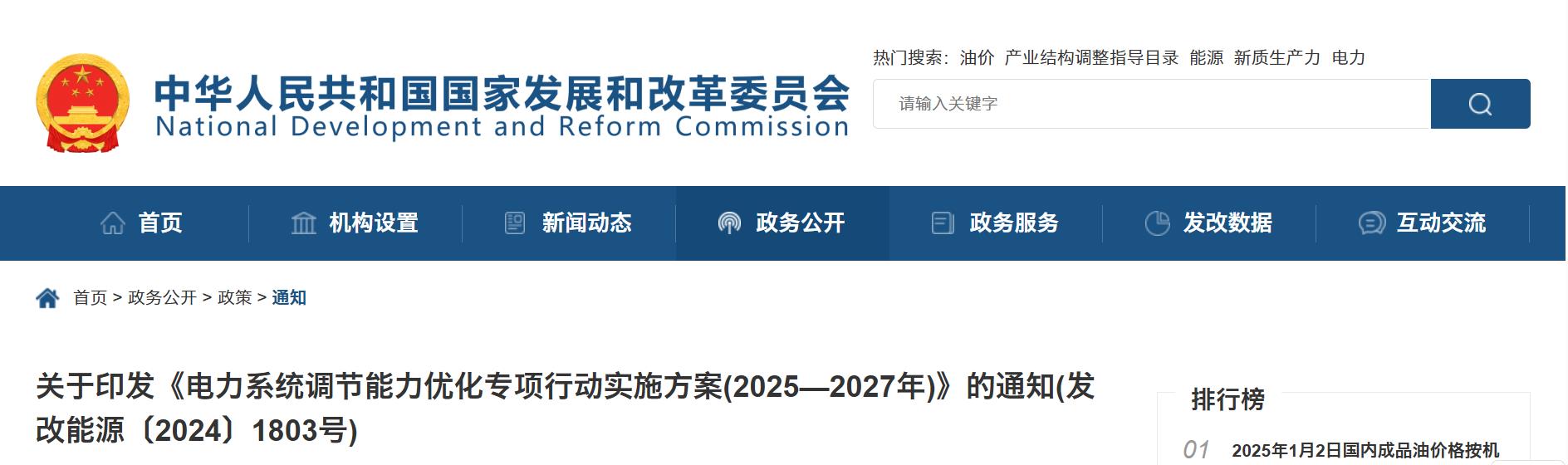 国家发改委、国家能源局印发《电力系统调节能力优化专项行动实施方案(2025—2027年)》(以下简称《实施方案》)。