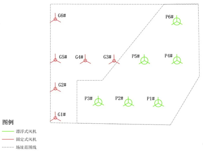一是其工程总装机容量为200MW,拟安装12台单机容量16MW~18MW海上风力发电机组,但并非全部为漂浮式机组。其中只有6台为漂浮式机组,其他则为固定式机组,分别安装于项目场址东南部水深较深区域与西北部水深较浅区域。