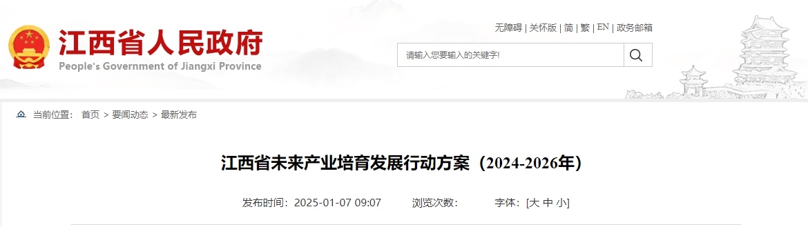 近日,中共江西省委办公厅、江西省人民政府办公厅印发了《江西省未来产业培育发展行动方案(2024—2026年)》,要求各地各部门认真贯彻落实。现将方案予以公开发布。