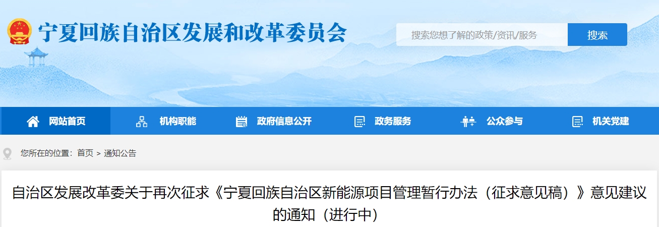 自治区发展改革委关于再次征求《宁夏回族自治区新能源项目管理暂行办法(征求意见稿)》意见建议的通知(进行中)