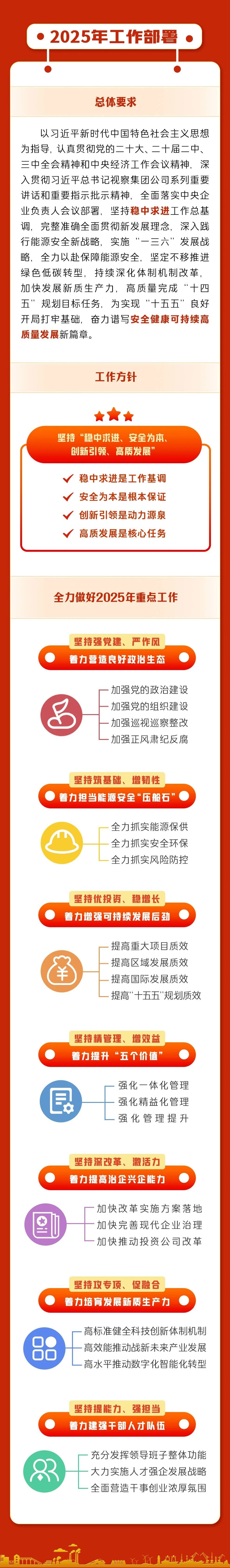 在2025年工作部署上,提出要以习近平新时代中国特色社会主义思想为指导,认真贯彻党的二十大、二十届二中、三中全会精神和中央经济工作会议精神,深入贯彻习近平总书记视察集团公司系列重要讲话和重要指示批示精神,全面落实中央企业负责人会议部署,坚持稳中求进工作总基调,完整准确全面贯彻新发展理念,深入践行能源安全新战略,实施“一三六”发展战略,全力以赴保障能源安全,"坚定不移推进绿色低碳转型,持续深化体制机制改革加快发展新质生产力,高质量完成“十四五”规划目标任务,为实现“十五五”良好开局打牢基础,奋力谱写安全健康可持续高质量发展新篇章。