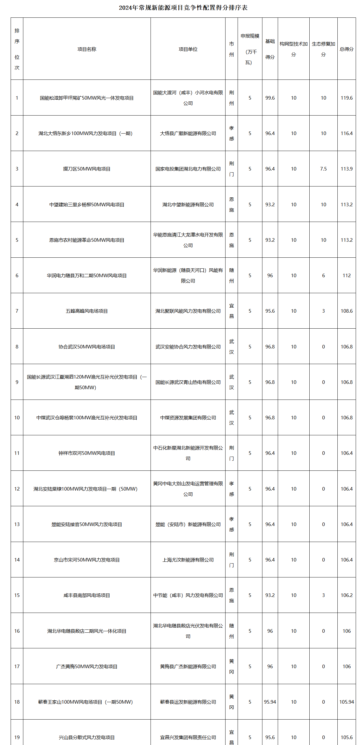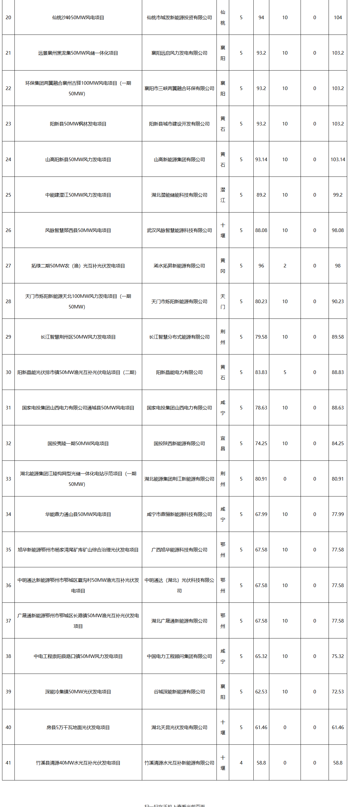 1月20日,湖北省能源发布公告,对2024年常规新能源发电项目竞配排序结果进行公示。公告称,此次对共计41个项目进行了材料审查和专家评审,评审结果如下:风电项目30个,规模135万千瓦;光伏项目10个,规模49万千瓦;风光一体化项目3个,规模15万千瓦;另一个5万千瓦项目未明确类型。项目名单如下: