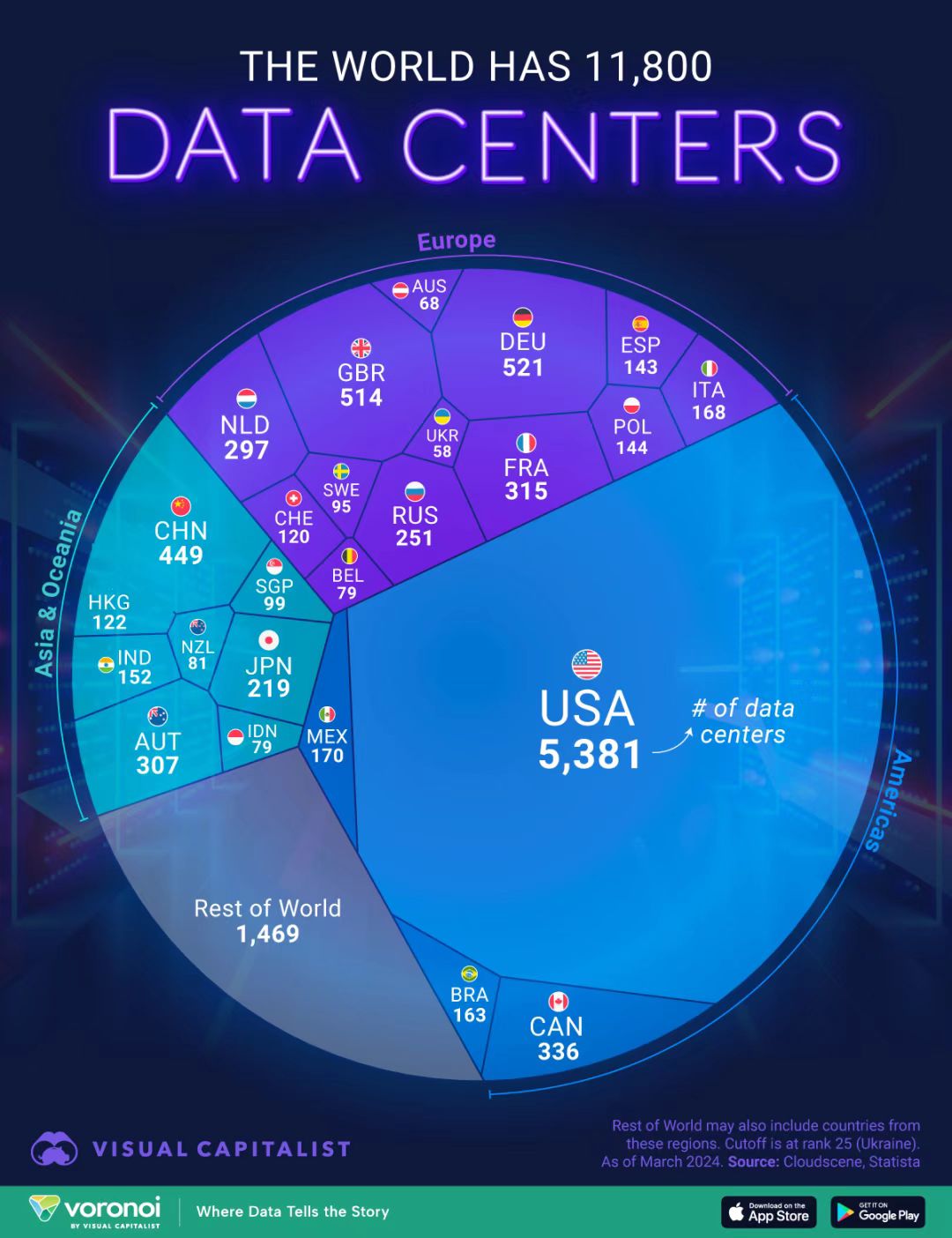 数据中心是数字世界的支柱,为社交媒体到云计算的一切提供动力。在这张信息图中,使用了Cloudscene的数据(通过Statista获取),展示了截至2024年3月一些国家和地区的数据中心数量。