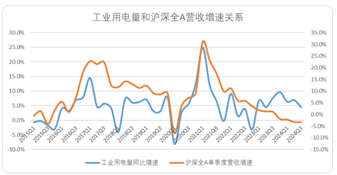 图片图:工业用电量和沪深全A营收增速关系,来源:Choice金融客户端,锦缎整理