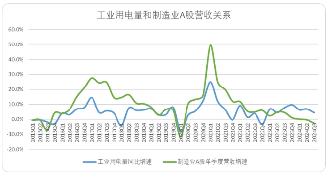 如果我们仅以制造业企业来看,即便实在2023年以后,工业用电量增速也与企业营收增速保持了相对稳定的态势,依旧是强相关。