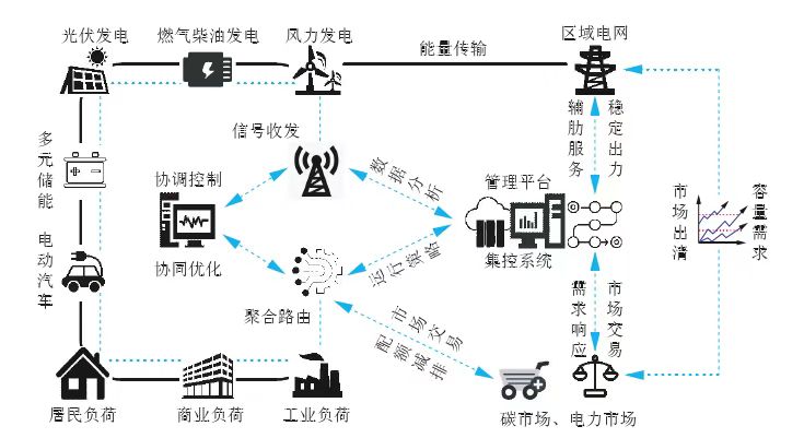本质上,虚拟电厂是利用先进的信息技术和通信技术,将分散在不同地理位置的分布式能源资源进行聚合和协调控制,使其能够像传统的大型发电厂一样参与电力市场交易和电网运行管理。