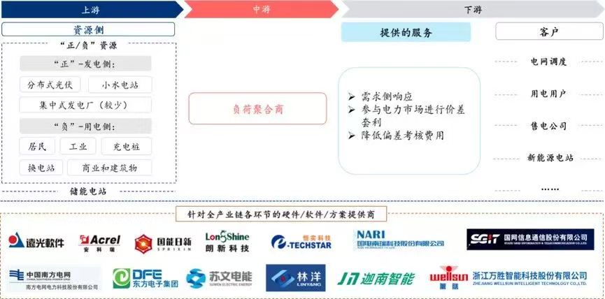 从产业链的角度来看,虚拟电厂包括:上游资源侧、中游负荷聚合商和下游客户。