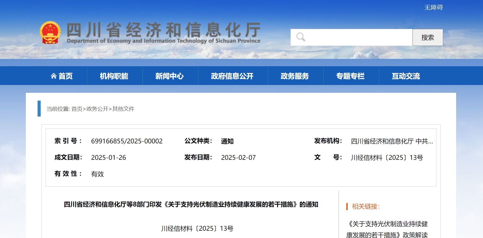 日前,四川省经济和信息化厅等8部门印发《关于支持光伏制造业持续健康发展的若干措施》的通知。