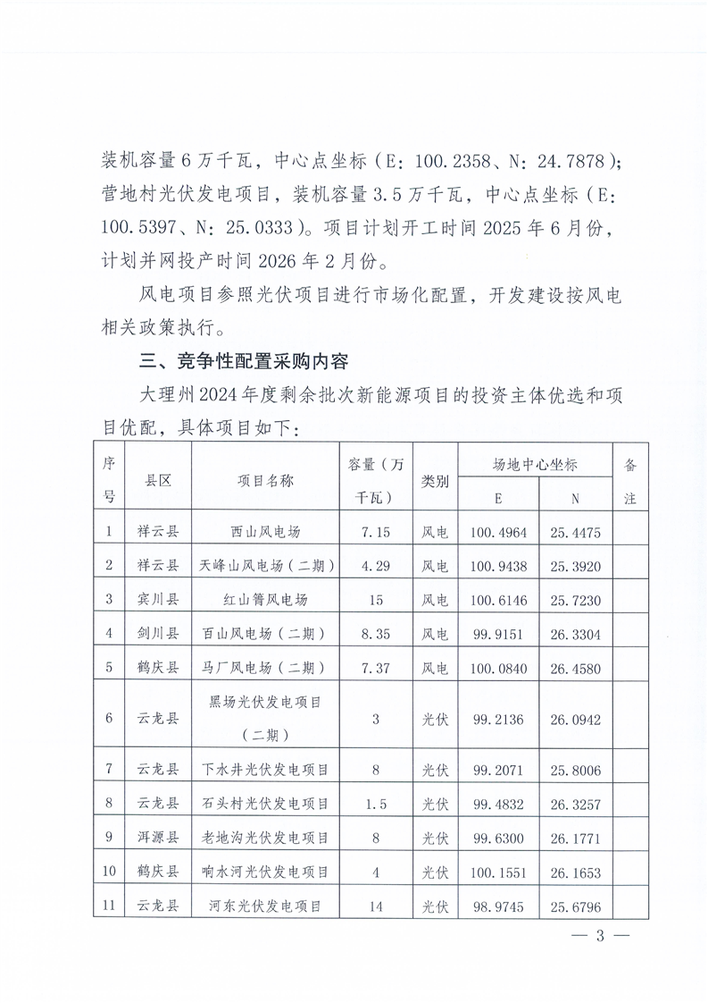 日前,云南大理州发布《关于大理州2024年度剩余批次新能源项目竞争性配置公告》。