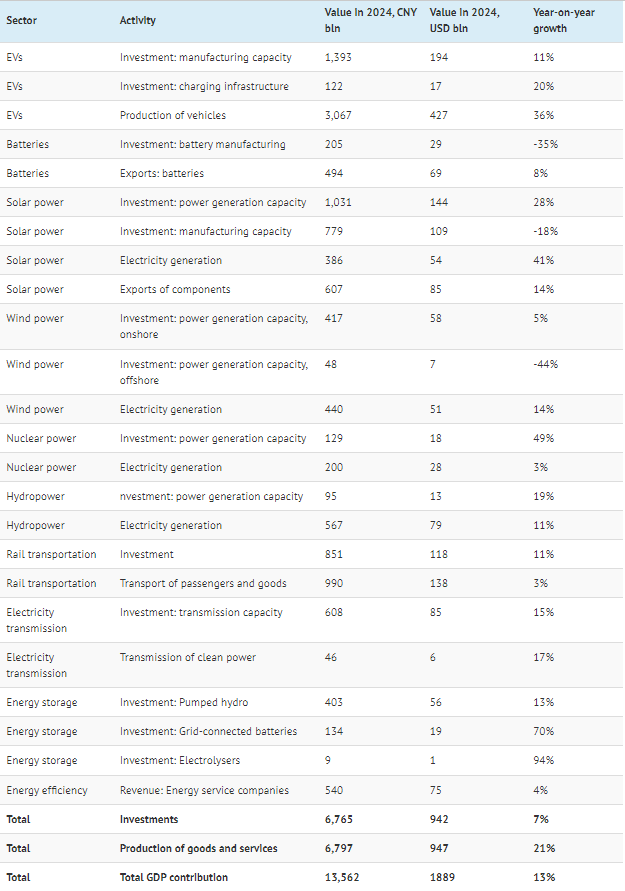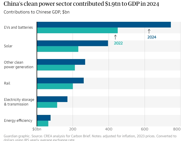 具体来看,2024年,电动汽车和汽车电池是中国清洁能源经济的最大贡献者,预计占总价值的 39%。