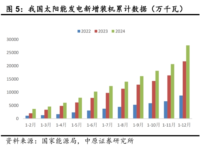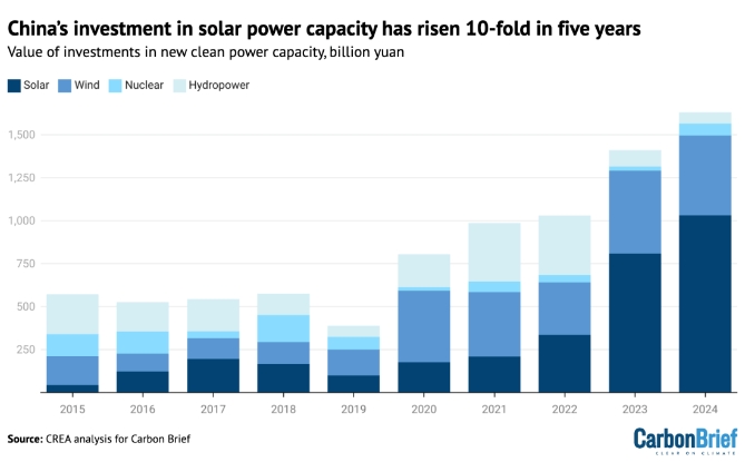 以太阳能发电为例,2024 年,中国新增太阳能发电容量约 277 吉瓦 (GW),较上年的 216 吉瓦同比增长 28%,创历史新高。同时,中国对新太阳能发电能力的投资激增,仅五年时间就增长了10倍;不过,2024 年太阳能制造产能增加速度有所放缓,反映出产品价格下跌和供应过剩。