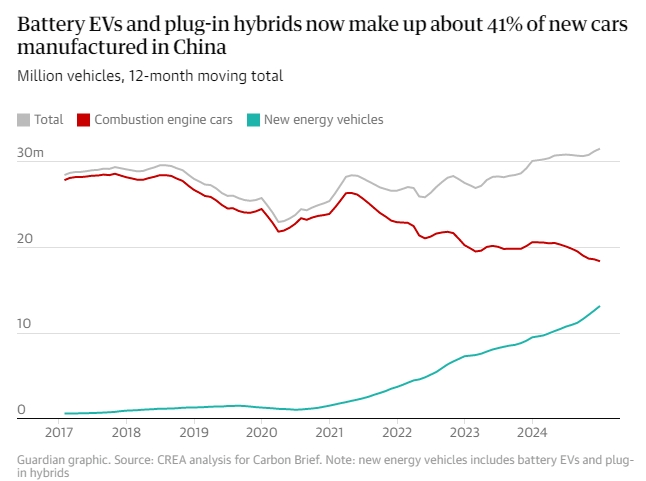 2024年,中国生产了1300万辆新能源汽车,同比增长34%,其中约有22%出口。中国新能源汽车产销首次突破千万辆大关,新能源汽车也成为了中国汽车制造商唯一的增长领域。此外,到2024年,新能源汽车占汽车总销量的41%,高于2023年的32%。