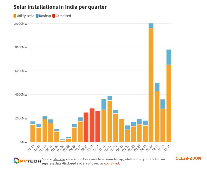 2024年最后一个季度,印度安装了7.8GW光伏,这一数字比2024年三季度的3.6GW翻了一番以上,同比增长超过300%,如上图所示。
