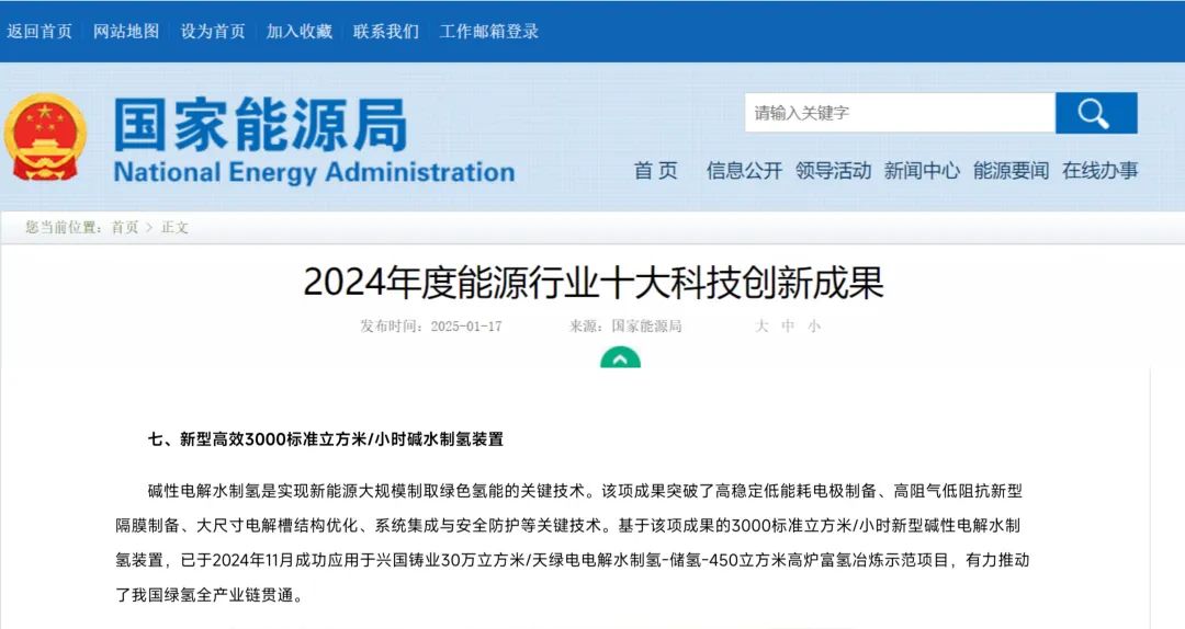 2025年1月,国家能源局“2024年度能源行业十大科技创新成果”公示,新型高效3000标准立方米/小时碱性水电解制氢装置被国家能源局评为“2024年度能源行业十大科技创新成果”,且已成功应用于兴国铸业“30万立方米/天绿电电解制氢—氢气存储—450立方米高炉富氢冶炼”示范项目。