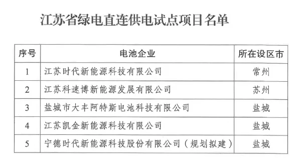 获悉,2月13日,江苏发改委发布《关于创新开展绿电直连供电试点项目建设工作的通知》(苏发改能源发〔2025〕115号)。首批公布了5个绿电直连供电试点项目,阿特斯、宁德时代等知名新能源公司的项目纳入试点。