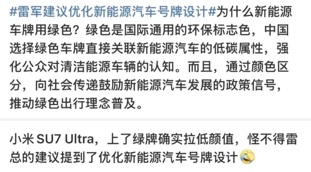 新能源车牌的设计问题看似微小,却能折射出我国新能源汽车产业在快速发展中面临的诸多挑战。雷军指出,现行绿色车牌不仅在视觉上与车辆设计兼容性差,还缺乏智能化功能,难以满足未来交通管理与出行需求,为此,他提出三大方向:重启号牌式样调研、拓展智能化功能、开展试点探索。
