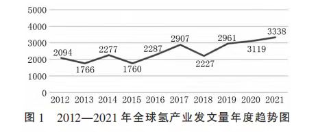 文献发表数量在一定程度上可以反映出某一学科在一定时期内的发展水平和速度。根据 2012-2021 年全球氢产业发文量年度趋势图(图1),近十年来,全球氢产业领域发文量总体呈现波动上升趋势,尤其在2014年日本取得氢燃料电池领域的重大技术突破后,世界各国纷纷将能源目光聚焦到氢能。近三年来,在化石能源的减少和全球气温升高的发展趋势下,诸多国家将氢能发展纳入国家战略,对氢能源的布局推动了各国研究者对氢产业研究领域的进一步关注,氢产业研究发文量高速增长。2019-2021年,全球氢产业发文量从2961篇增至 3338 篇,增长率为 12.7%,发文量达历史峰值。在此期间,多个国家颁布了有关氢能源的发展规划如 2019 年澳大利亚发布了《国家氢能战略》;2020年美国发布了《氢能项目计划》:英国以建设氢气供应管道网络为核心制定氢气网络计划。中国从2016年开始将氢能纳入能源技术革命,逐步发展氢产业链核心技术,推动新能源汽车产业的发展。
