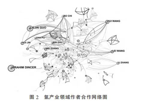 该图谱中不同的节点(圆圈)代表不同的作者,圆圈越大表明作者的发文量越高。不同节点之间的连线表明作者之间的合作情况,从同一节点发出的连线越多,表明该作者与其他作者的合作频次越高。图2为氢产业领域作者合作网络图,通过调整值,图2中显示除了该领域发文量前10名的作者,圆圈最大的作者为 Ⅲbrahim Dincer,表明该作者在氢产业领域的发文量最多,其次是 Lie jinGuo。