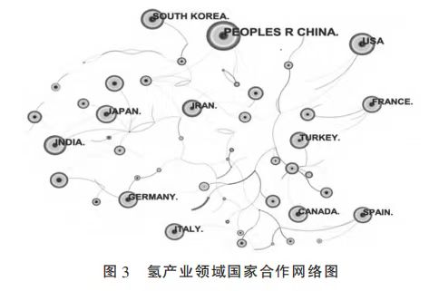 通过深度挖掘并统计发文量排名前10位作者信息,用生产力和影响力两个指标来衡量作者在氢产业领域内的发文质量。其中,生产力包含发文量和年均发文量两个统计量,影响力包括总他引次数和篇均他引次数两个统计量。从发文数量上看,排名前三位的依次是来自加拿大的 Ibrahim Dincer,来自中国的Liejin Guo 和 Wang Hui,他们的发文量依次是132、121、61篇。从篇均他引次数上看,Ibrahim Dincer,JinHui,Li Zhang 分别以 29.22、28.98、24.73 次的篇均他引次数排名前三。这组数据表明了这三位作者在氢产业领域的学术认可度和权威性。从所属国别上看,发文量排名前 10位的作者中有8名是中国作者,这表明中国学者在氢产业领域研究成果丰硕。2.国家合作网络。在科技创新和难点技术攻关上,国家间的合作有利于加快科学技术突破和增强科技创新能力。图3为氢产业领域国家合作网络图,展现了发文量全球排名前10位的国家。圆圈节点代表不同的国家,节点越大表明该国发文量越高,连线代表国家间的合作。从节点大小看,中国的发文量遥遥领先。但从连线上看,国家间的合作频次不高,这从侧面反映了新能源国运之战使世界各国在氢能及相关技术研究上处于竞争关系。