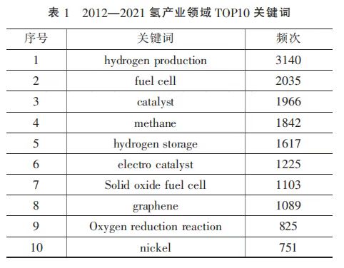 在氢能产业相关文献收集中,为了确保源数据的科学权威性及覆盖全面性,本文以 Web of Science 数据库核心合集为数据来源。根据已有学者研究,通过主题词检索(TS)确保检索结果的查全率设定检索式为 1S=(“hydrogen energy"and“hydrogenindustry”)。检索时间范围为 2012-2021年,检索结果共计 26169 篇文献。