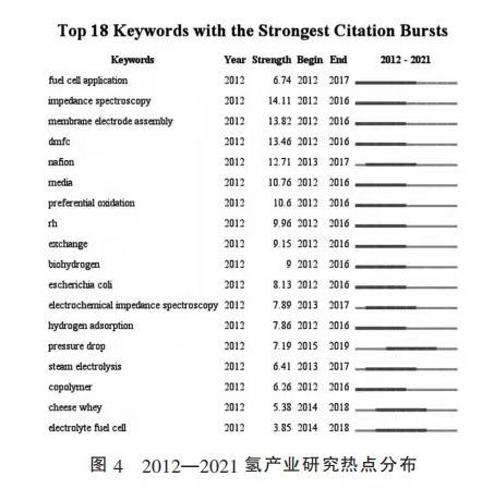 突发词指某个变量在短时间内成为学术研究的热点,这个变量不仅仅限于文献中的关键词,还可以是研究主体或文献被引频次。突发词探测的作用在于分析大量文献中的研究热点以及这一热点被研究的起止时间,在一定程度上可以预测未来的研究趋势。利用 CiteSpace 软件进行突发词探测时,调整参数γ的值,γ的取值为[0,1],γ值越大表示突发词的数量越多。参数 Minimum 表示突发词起止时间的最小年数,该参数越小,显示的突发词越多,由于本文数据量较大,故所设参数 Minimum 值为5。图4为近10年来全球氢产业领域前18的突发词,图中每个小横条表示一年,红色区域表示该突发词出现的起止时间。例如:“steam electrolysis”一词在 2013 年成为研究热点,终止于 2017 年,突变时长为5年。