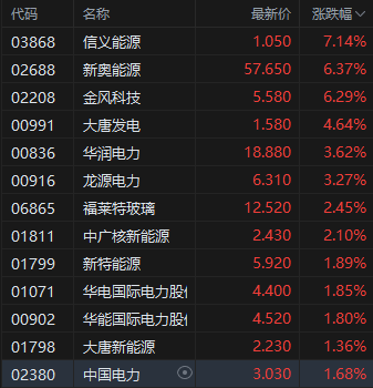 港股绿电概念股集体大涨,风电、氢能源概念、光伏太阳能齐涨,截至发稿,信义能源涨超7%,新奥能源、金风科技涨超6%,大唐发电涨超4%。