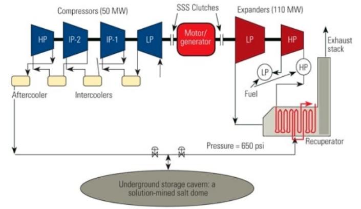 例如,阿拉巴马州的McIntosh电厂由公用事业公司Power South拥有。它由一台机械传动链组成,包括两台西门子能源压缩机和膨胀机、一台电动发电机以及一个巨大的盐穴。压缩储藏室约需40小时,之后发电机可满负荷运行约25小时。该机组能在9分钟内紧急启动,且全年运行。其动力传动链由低压(LP)、中压(IP)和高压(HP)压缩机、低压和高压涡轮膨胀机以及SSS离合器制造的同步自换挡(SSS)离合器组成。离合器的接合或分离控制电动发电机是驱动压缩机还是为电网发电。