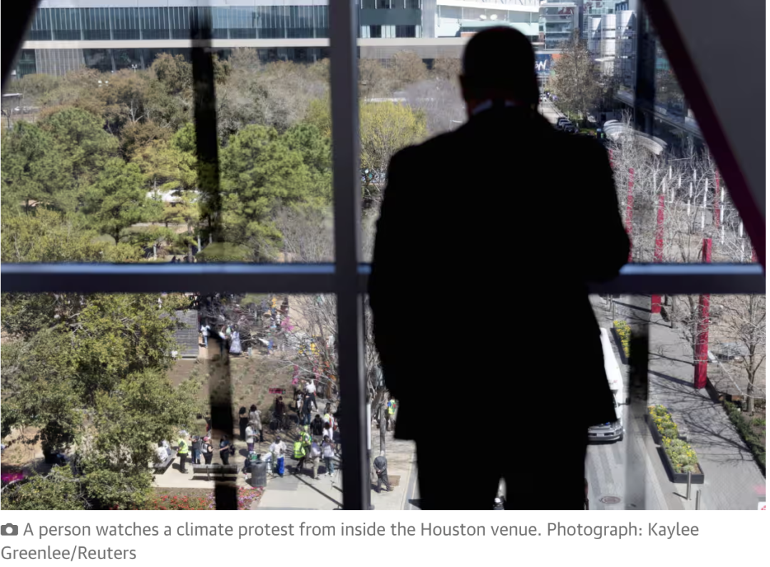 ⬆️会场内默默注视气候抗议游行的参会者然而,并非所有人都对美国能源产业现状感到满意。剑桥能源周首日天,来自美国各州数百名活动人士举行了抗议活动,成为该会议历史上的最大骚乱。