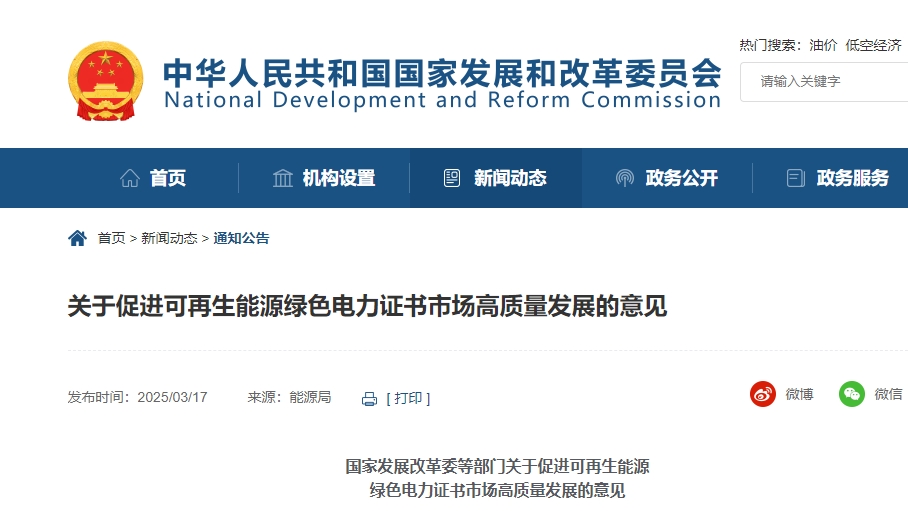 3月18日,国家发展改革委等五部门发布关于促进可再生能源绿色电力证书市场高质量发展的意见。