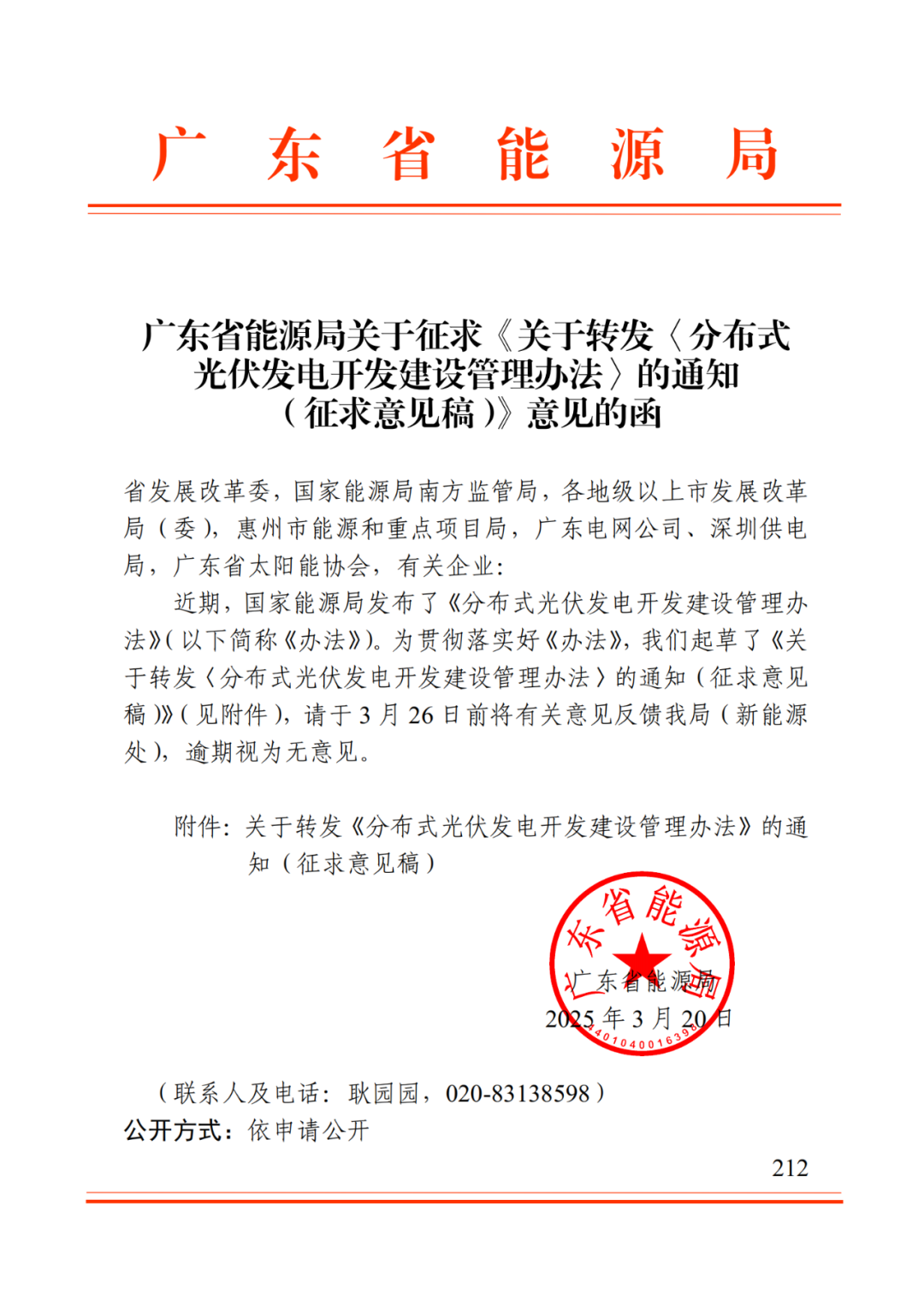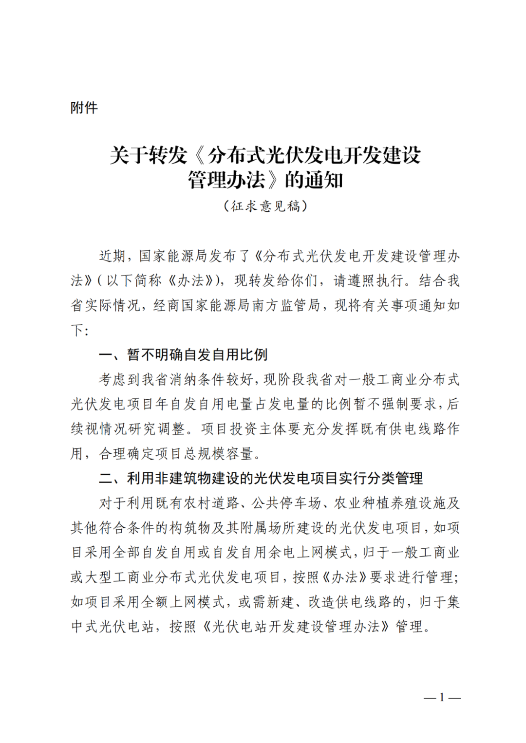 3月20日,广东省能源局发布关于征求《关于转发(分布式光伏发电开发建设管理办法〉的通知(征求意见稿)》意见的函。通知提出: