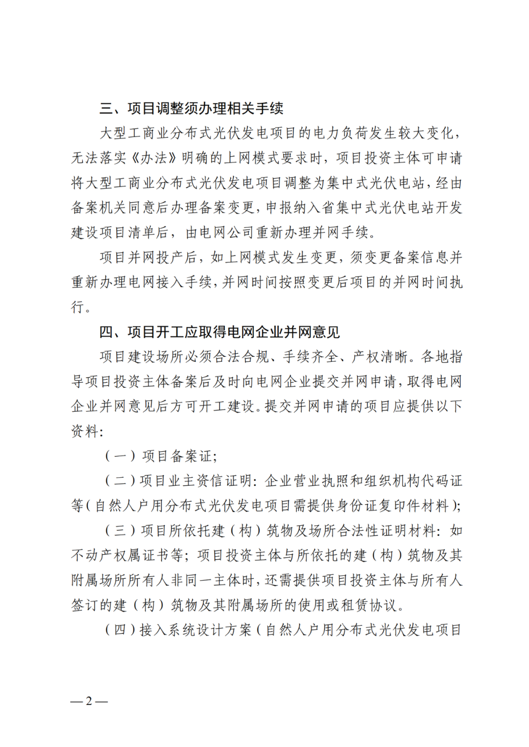 同时,意见提出:项目调整须办理相关手续:大型工商业分布式光伏发电项目的电力负荷发生较大变化,无法落实《办法》明确的上网模式要求时,项目投资主体可申请将大型工商业分布式光伏发电项目调整为集中式光伏电站,经由备案机关同意后办理备案变更,申报纳入省集中式光伏电站开发建设项目清单后,由电网公司重新办理并网手续。