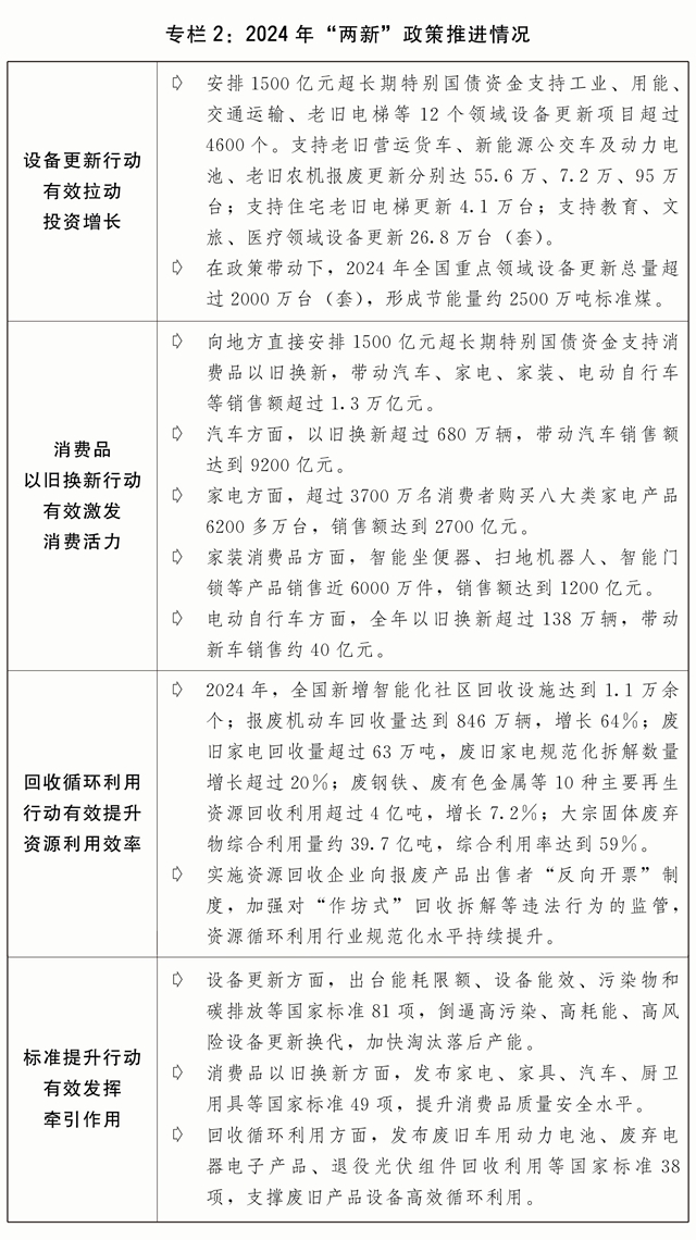 三是大规模设备更新和消费品以旧换新政策落地见效。印发“两新”行动方案,出台工业、建筑市政、交通、农业、教育、文旅、医疗等七大领域设备更新实施方案和消费品以旧换新、回收循环利用、标准提升引领行动方案。安排3000亿元超长期特别国债加力支持“两新”工作。2024年,“两新”政策带动全国设备工器具购置投资增长15.7%,高于固定资产投资(不含农户)增速12.5个百分点;限额以上单位家用电器和音像器材类、家具类商品零售额分别增长12.3%、3.6%,带动大宗耐用消费品销售额超过1.3万亿元;消费品以旧换新活动中,新能源汽车销量占比超过60%,一级能效家电销售额占比超过90%。