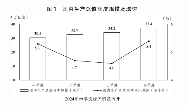 (一)因时因势加强和创新宏观调控,推动经济回升向好。扎实开展宏观政策逆周期调节,加大政策力度,释放政策效能,特别是9月26日中央政治局会议果断部署一揽子增量政策,市场预期、社会信心有效提振,四季度经济明显回升。全年国内生产总值(GDP)134.9万亿元、增长5%,其中,一、二、三产业分别增长3.5%、5.3%、5%。