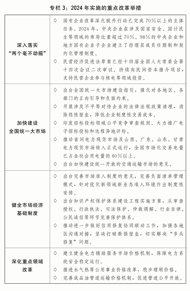 一是“两个毫不动摇”要求进一步落实落细。深入实施国有企业改革深化提升行动。深化国有经济布局优化和结构调整,健全国有企业投资管理制度,完善国有企业分类考核评价体系。加快推动民营经济促进法立法。建立促进民营经济发展壮大部际联席会议制度,健全国家、省、市、县多层级政企常态化沟通交流和问题解决机制,上线运行民营经济发展综合服务平台,帮助民营企业解决实际问题。开展清理拖欠企业账款专项行动。支持专精特新中小企业发展,累计培育“小巨人”企业1.46万家。传承弘扬“晋江经验”,实施新时代民营企业家培养赋能计划,大力弘扬企业家精神。出台完善中国特色现代企业制度的意见,加快培育世界一流企业。