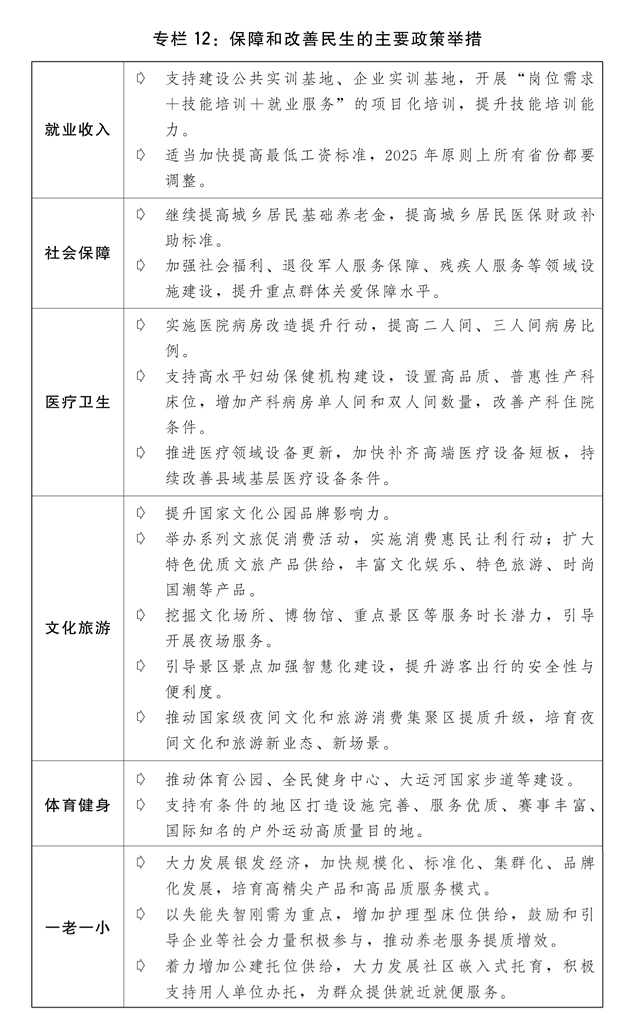 一是实施提振消费专项行动。制定提升消费能力、增加优质供给、改善消费环境政策举措,稳定大宗消费、扩大服务消费、拓展新型消费、合理增加公共消费,推动消费提质升级。多渠道促进居民增收,推动中低收入群体增收减负,完善劳动者工资正常增长机制。因城施策调减房地产消费限制性措施,推动建设安全、舒适、绿色、智慧的“好房子”,更好满足人民群众刚性和改善性住房需求、高品质居住需要。进一步优化汽车限购管理政策,加快构建充电基础设施体系,开展汽车流通消费改革试点。加快拓展文化、旅游、体育、健康、养老、托幼、家政、数字等服务消费,实施服务消费提质惠民活动、“百城百区”文化和旅游消费行动计划。加快培育带动性广、显示度高的消费新场景,支持影视游戏创作与中华优秀传统文化、特色旅游资源相结合等融合式沉浸式消费新场景发展。积极发展首发经济、冰雪经济、银发经济。完善游艇、房车露营等新型消费领域管理机制和行业标准,促进“人工智能+消费”,优化消费新业态新领域市场准入环境,加快推动各类新技术应用推广并向消费级产品转化。清理对消费的不合理限制。深入实施优化消费环境三年行动,加强消费信用体系和质量标准体系建设,规范网络销售、直播带货领域不合理经营行为,强化消费者权益保护。落实和优化带薪年休假制度。完善外国人入境居留政策和免税店政策,推动扩大入境消费。深化国际消费中心城市建设。