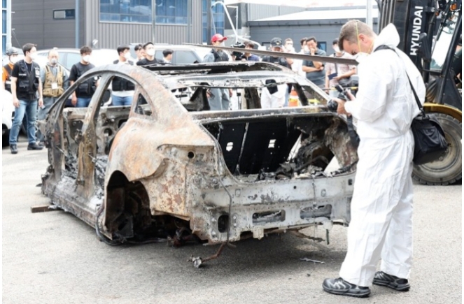 图说:2024年8月8日,梅赛德斯奔驰官员在韩国仁川调查期间拍摄了起火的电动汽车照片