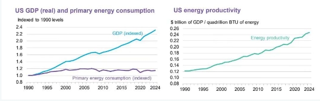 2024年,美国经济增长2.8%,而一次能源消耗同比仅增长0.5%。这一增长率差异使得“能源生产率”(即美国国内生产总值(GDP)与一次能源总消耗量的比值)在去年提高了约2.3%。从更长远的角度来看,过去10年美国GDP增长了27.6%,而一次能源消耗却下降了 1.3%,这意味着美国能源生产率在这10年间提升了29.3%。