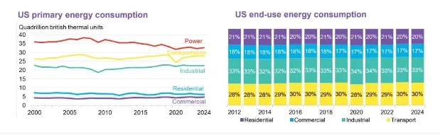 发电消耗的能源同比增长 1.74%,达到 32.7万亿英热单位(BTU)。与过去十年相比,这一数值下降了8.6%,延续了电力部门能耗自2007年达到38.5万亿英热单位峰值后的总体下降趋势。从 2023年到2024年,各相应终端用途的能耗占总能耗的比例保持不变。
