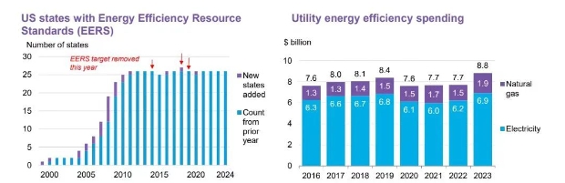 能源效率资源标准(EERS)是州一级的政策,要求公用事业公司投资于提高终端用户效率的措施,通常旨在实现政府设定的节能目标。2024年,美国26州和哥伦比亚特区实施了 EERS 政策。受疫情影响,2019-2020 年能效支出大幅下降,到2023年(有完整数据的最近一年),能效支出回升至疫情前水平。根据美国节能经济委员会(ACEEE)数据统计,2022-2023 年,能效支出同比增长 14.4%,达到88亿美元。