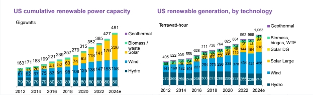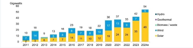 2024年,太阳能装机量创新纪录,受此推动,美国新增可再生能源装机容量总计54吉瓦,比2023年增长29%。尽管面临债务成本高、场地审批受限和电网接入瓶颈等挑战,但各州和公用事业公司的脱碳目标对可再生能源的稳定需求,以及企业买家对清洁能源的青睐,支撑了清洁能源的部署。