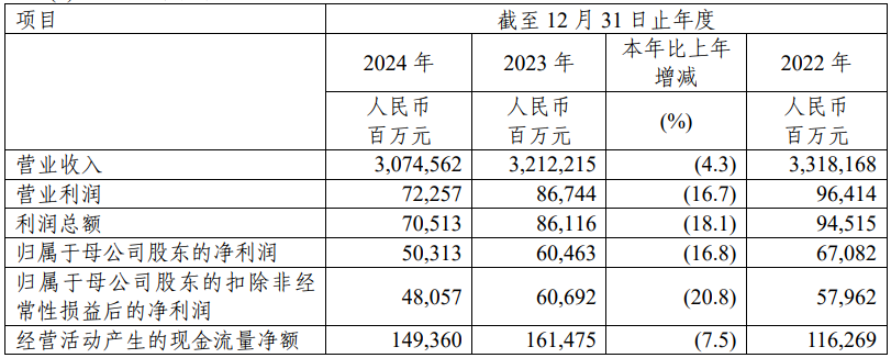 2024年,中国石化实现营业收入30745.62亿元,同比下降4.29%;归母净利润为503.13亿元,同比下滑16.79%。业绩下滑的主要原因是化工板块的亏损扩大。
